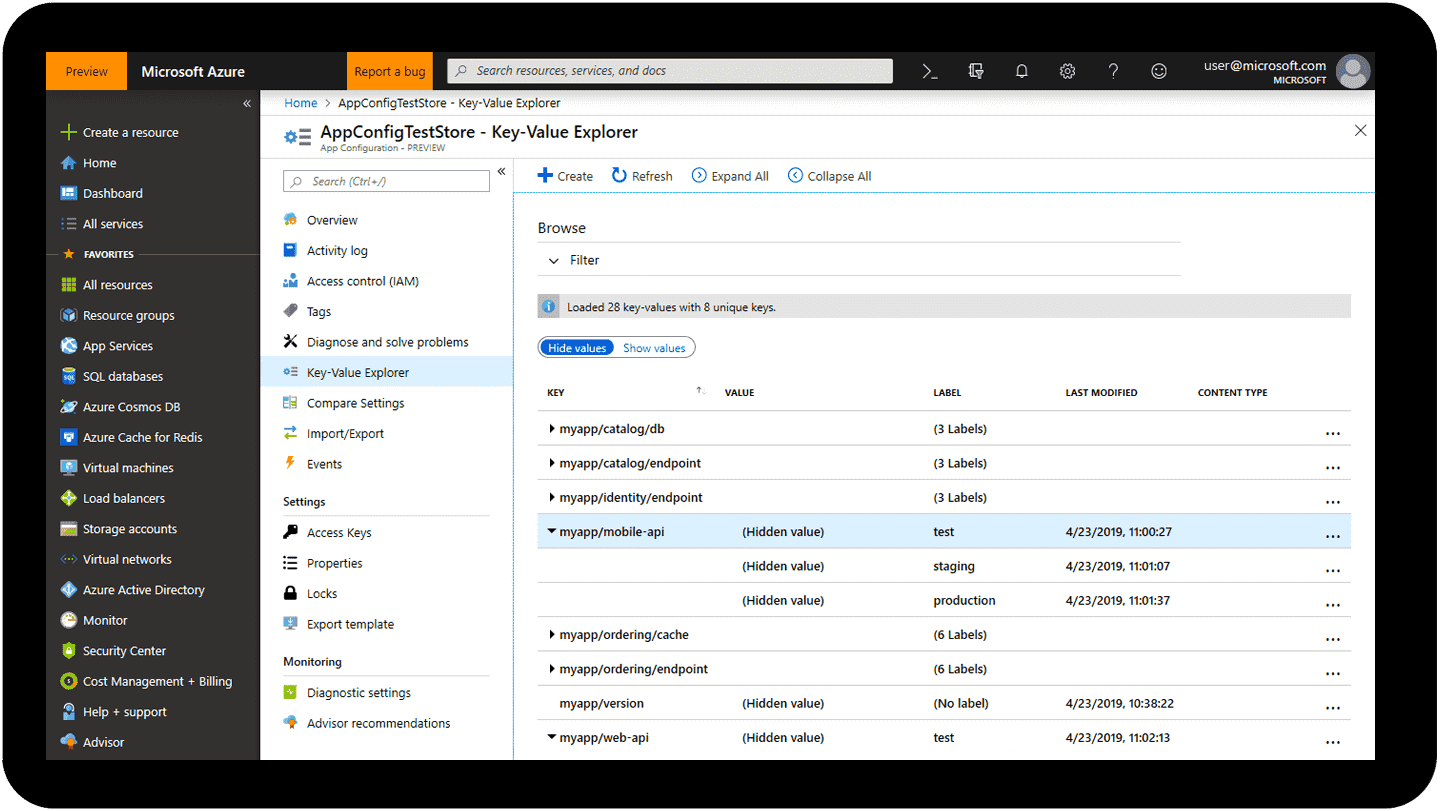 Store configuration for all your Azure apps in a universal, hosted location. Manage configurations effectively and reliably, in real time, without affecting customers by avoiding time-consuming redeployments. Azure App Configuration is built for speed, scalability, and security.