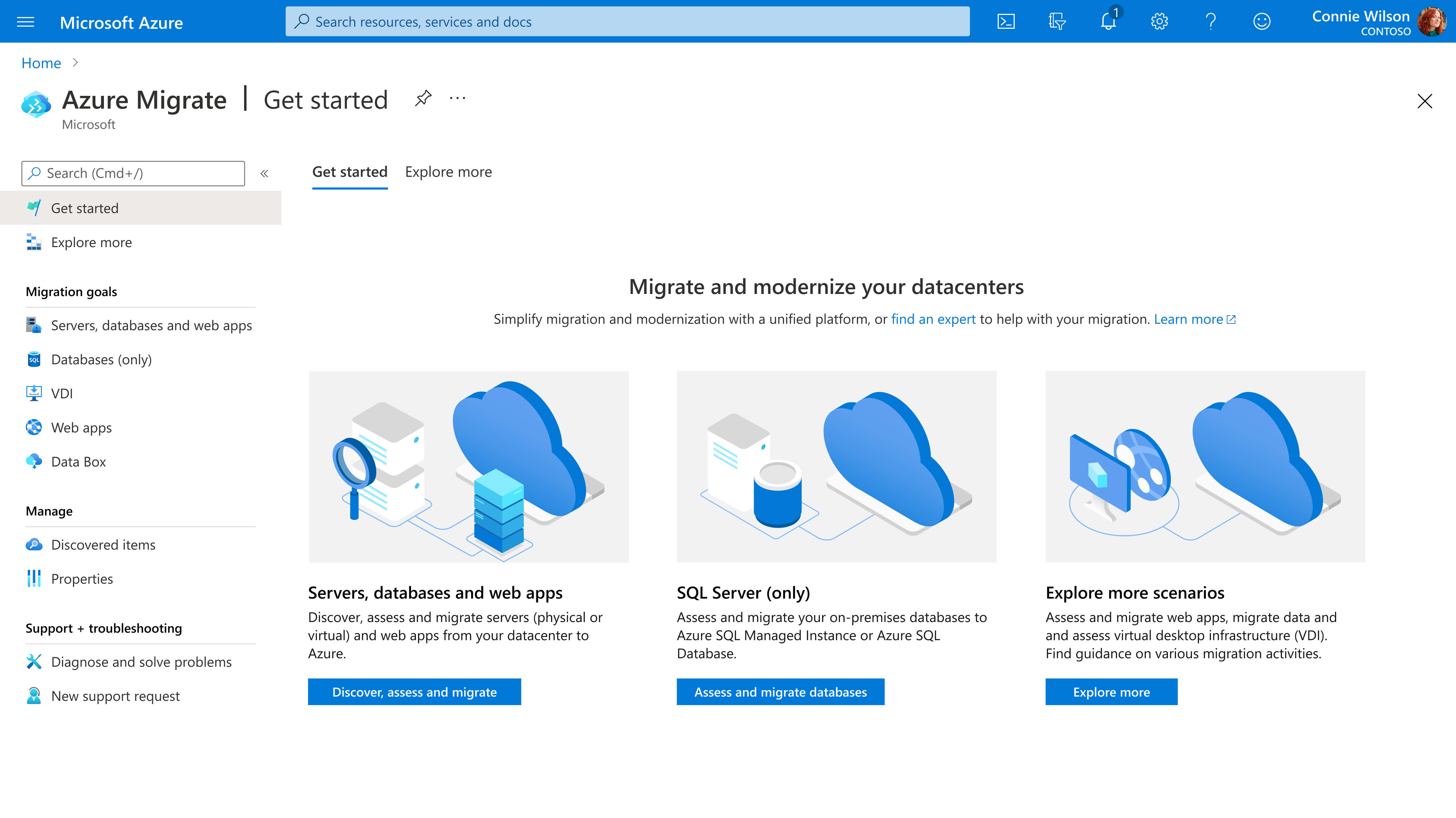 Start your migration to Azure by discovering and assessing on-premises resources and planning your move with insights. Migrate to Azure in waves and modernize for fast innovation and a high return on investment (ROI). Track and manage your progress using a central dashboard.