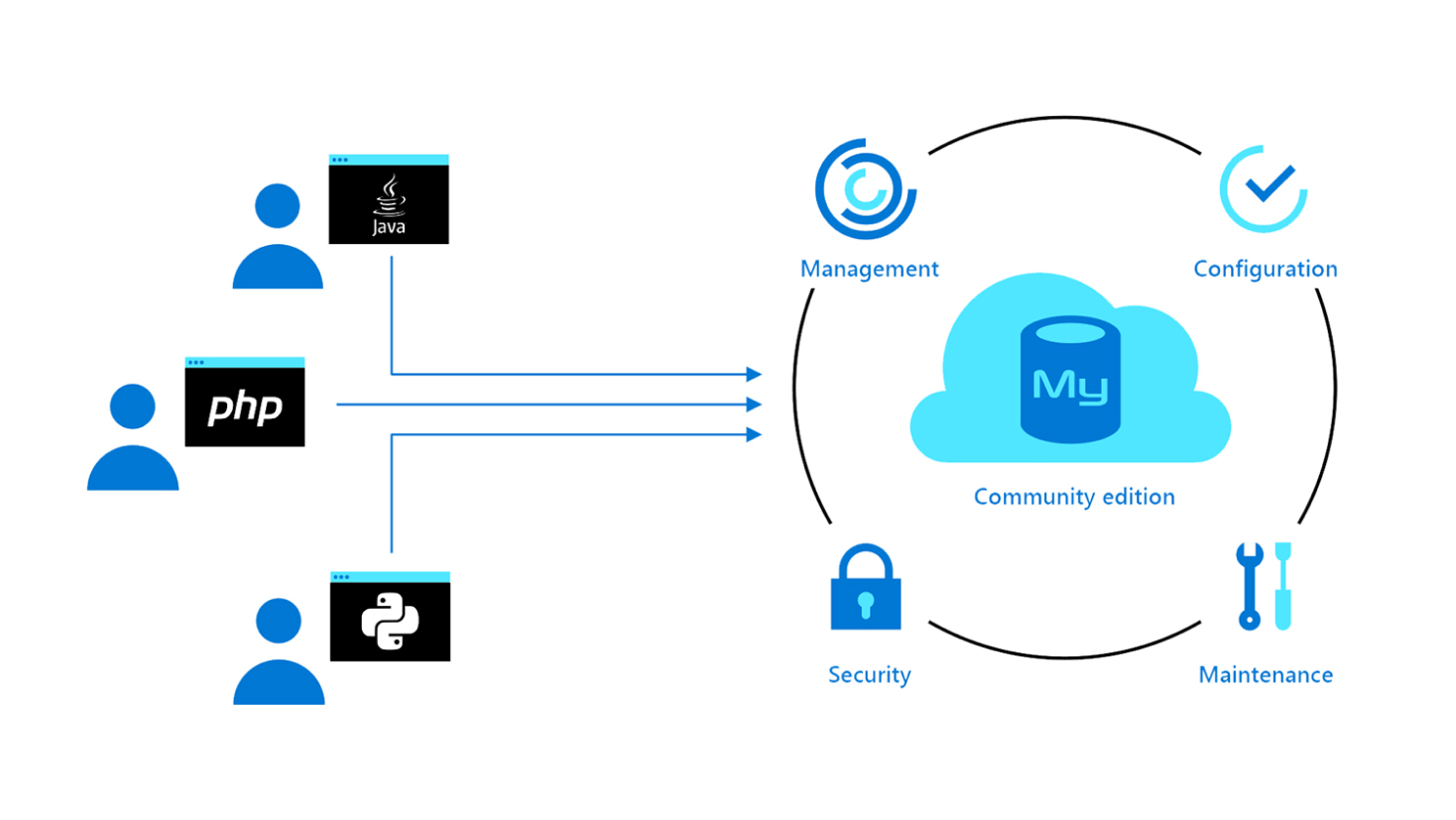 Achieve faster innovation and increased productivity with a simplified end-to-end deployment experience with flexible server. Ship faster by leveraging GitHub integration for your CI/CD pipeline. Tap into the Azure ecosystem by using Azure Database for MySQL with Azure AI Services, Azure Kubernetes Service (AKS), or Azure App Service to deploy popular web apps, including Magento, Shopify, Moodle, Alfresco, Drupal, and WordPress.