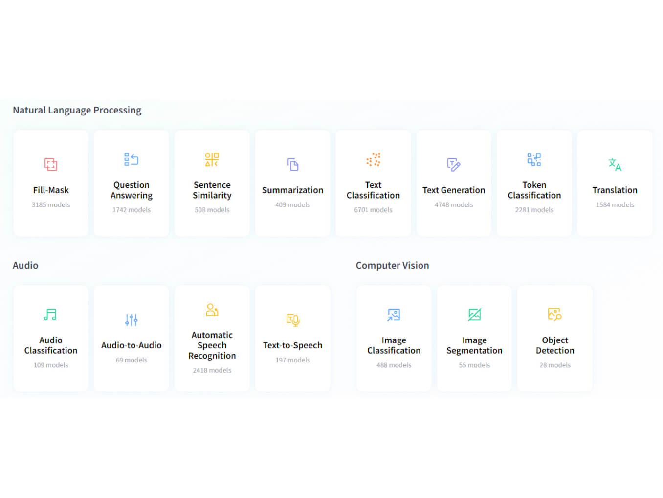 Choose from tens of thousands of machine learning models for Natural Language Processing, Audio, and Computer Vision, publicly available in the Hugging Face Hub, to accelerate your machine learning workload.