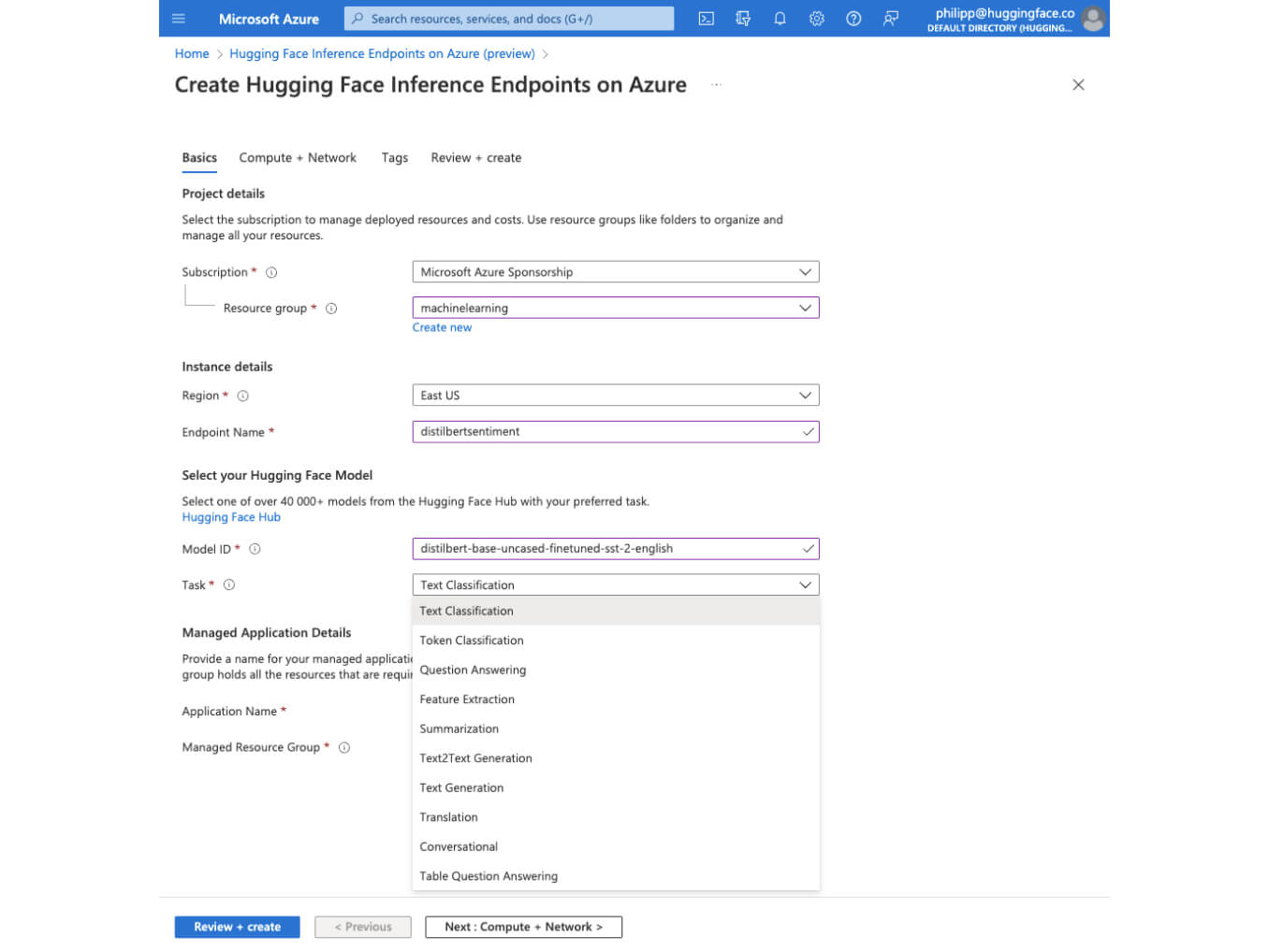Hugging Face is the creator of Transformers, the leading open-source library for building state-of-the-art machine learning models. Use the Hugging Face endpoints service (preview), available on Azure Marketplace, to deploy machine learning models to a dedicated endpoint with the enterprise-grade infrastructure of Azure.