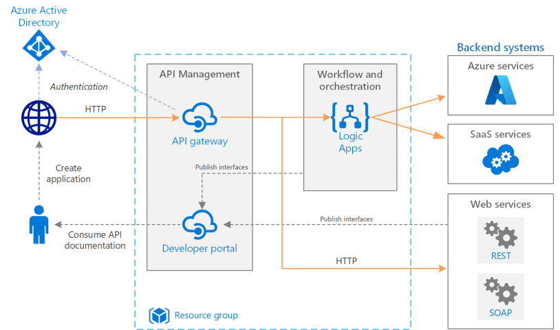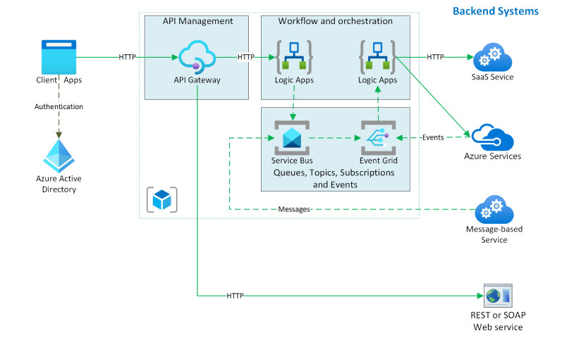 Use Azure services such as Azure Logic Apps and Azure API Management to orchestrate calls to enterprise back-end systems including Azure services, software as a service (SaaS) systems, and web services.