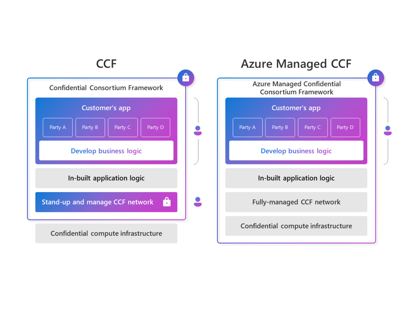 With Azure Managed Confidential Consortium Framework Preview, a managed application development platform that utilizes the open-source Confidential Consortium Framework, build applications that centralize computation while providing decentralized trust. Azure Managed CCF helps you develop stateful apps with programmable confidentiality and high integrity in a trusted execution environment enabled by Azure confidential computing.